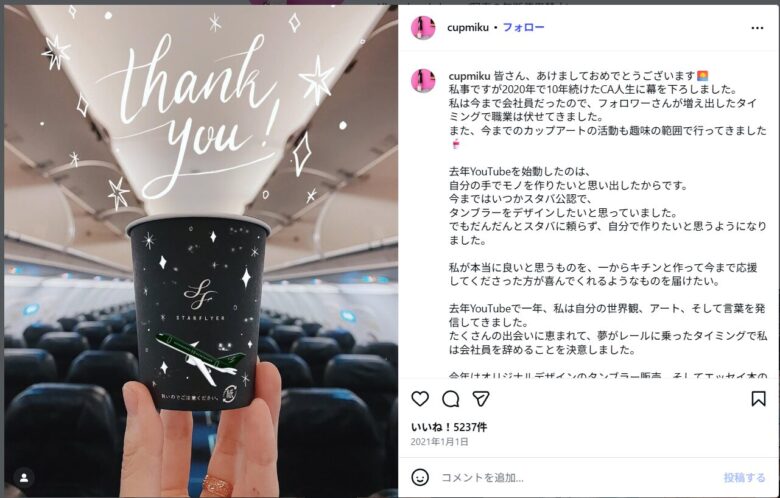 当時カップデザイナーとしてのInstagramアカウントで航空会社を退社したことを報告していました。